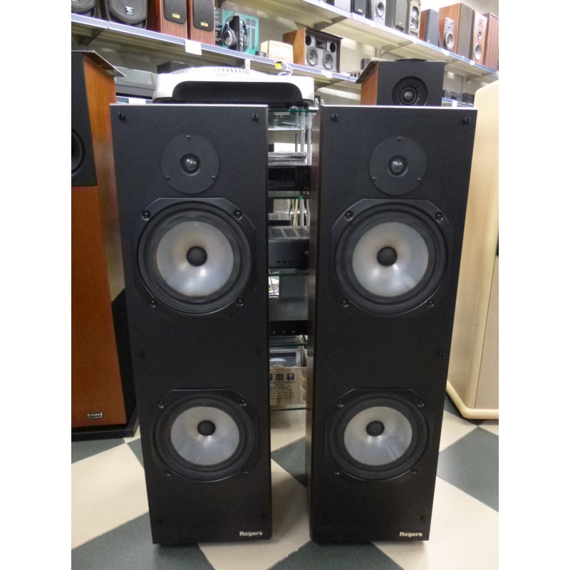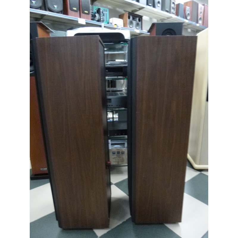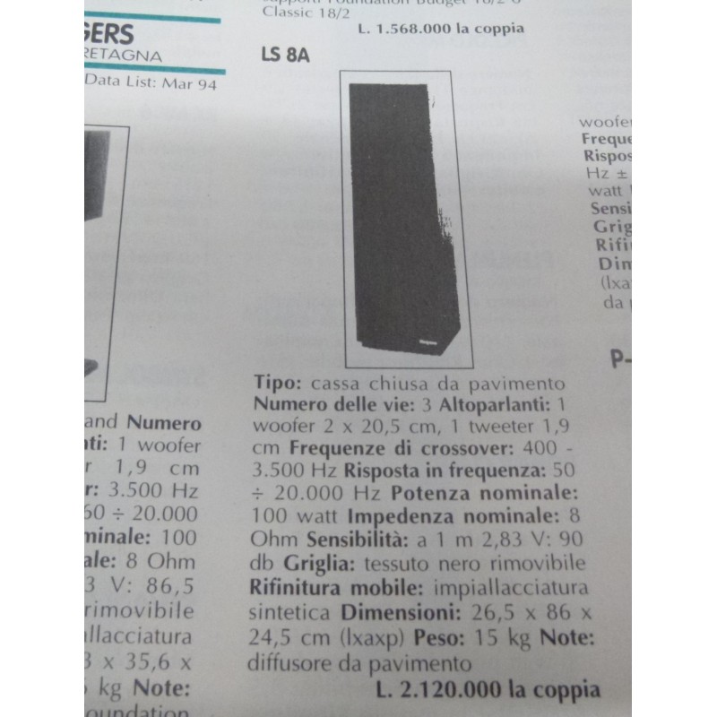 Coppia diffusori Made in England, cassa chiusa a 3 vie, 2 woofer da 20,5 cm, tweeter da 1,9 cm, 100 watt RMS, 8 ohm, sensibilità 90 dB, risposta in frequenza 50-20.000 Hz, dimensioni 265x86x245, peso 15 kg.